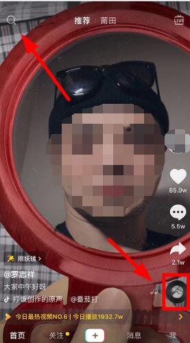 1、现在如果想要拍摄制作“照妖镜”的特效视频,我们就需要先在“抖音”APP里搜索“照妖镜”关键词,找到对应的视频点击右下角按钮(如下所示)。