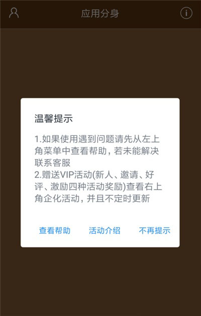 2. 打开下载好的“星极多开/星级分身定位”,这时会出现帮助提示以及活动提示,对于第一次使用这个app的小伙伴们来讲,小编建议你们浏览一下“帮助文档”以便深入了解。