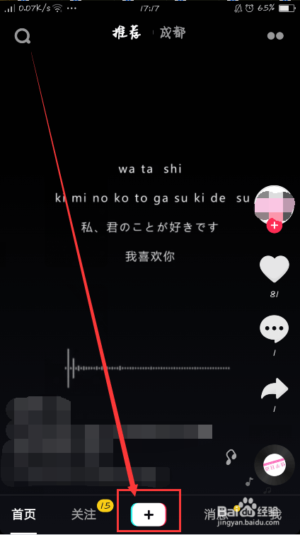 1、首先打开我们的手机上的抖音,进入抖音主界面,然后在点击主界面的加号。如图所示。