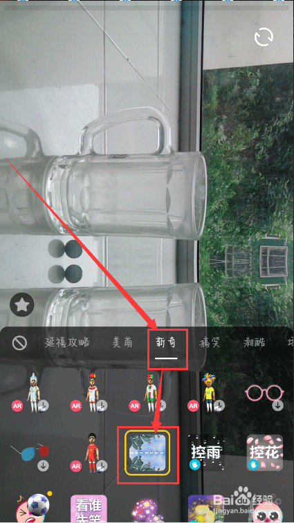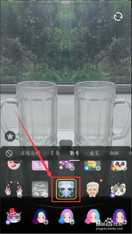 4、在道具的新奇,还有一个左右镜像道具,点击左右镜像道具,点击左右镜像道具按钮进行录制视频,就行了。根据你的喜好选择是上下镜像还是左右镜像拍摄吧!如图。