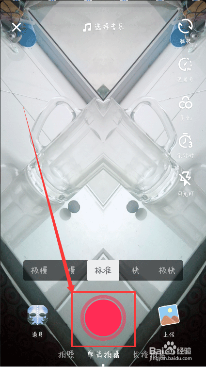 5、让后轻点上方屏幕,回到我们刚刚的界面。点击红色拍摄按钮,找好角度,进行视频的拍摄。如图所示。