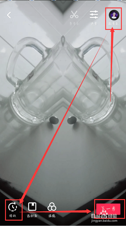 6、拍好了之后点击右上角选择音乐,跟视频配音,然后在点击左下角,进行特效的处理。再点击下一步。