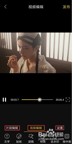 4、在视频编辑页面,可以对视频进行“片段编辑”、“高级编辑”、“设置”等操作,根据需要对视频进行编辑。