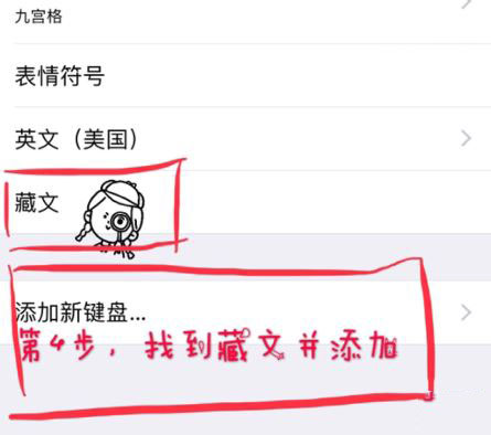 打开手机设置-通用-键盘-增加新键盘(藏文)
