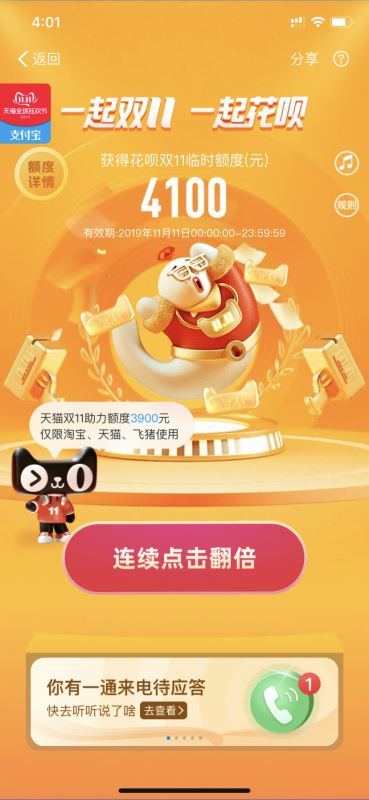 双11花呗临时额度领取具体方法