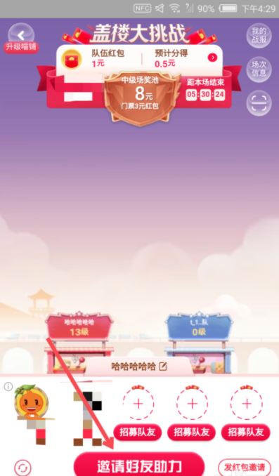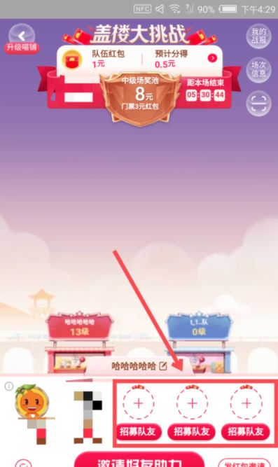 点击“招募队友”,可以招募别人加入你的队伍,队友只有每天登陆“盖楼大挑战”,她的等级才能被算到队伍总等级里。