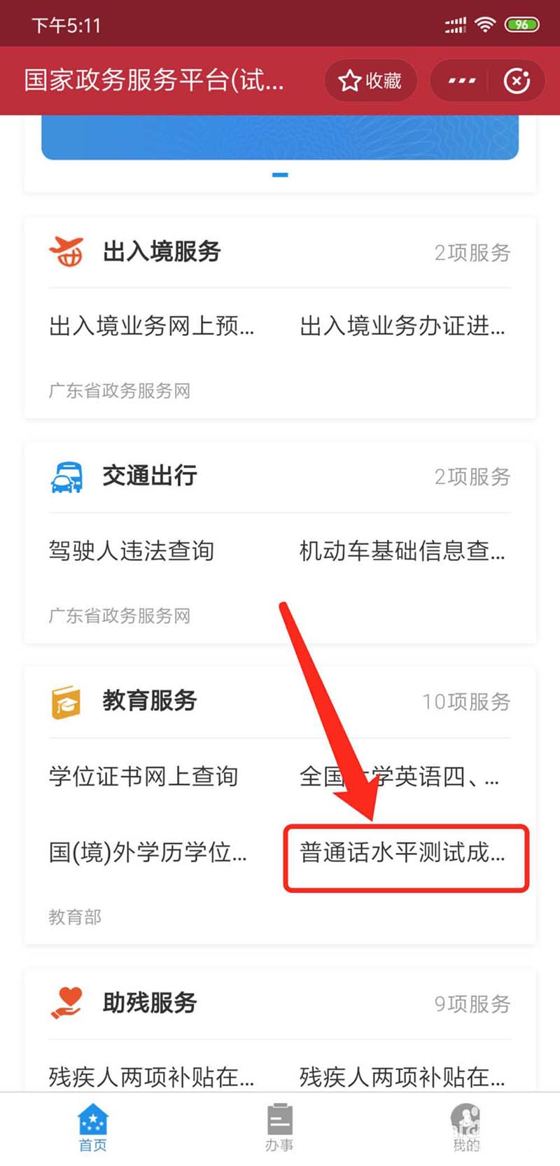 6、点击【普通话水平测试成绩】功能。