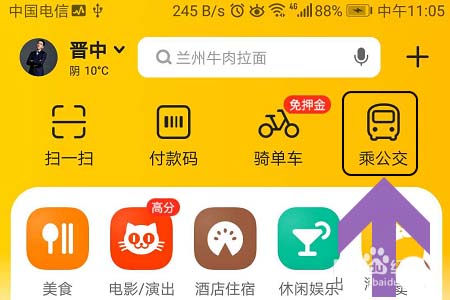 1、打开美团APP以后,系统会自动进行定位,如果我们所在城市支持扫描乘公交,那么首页面右上角会有显示,见下图...