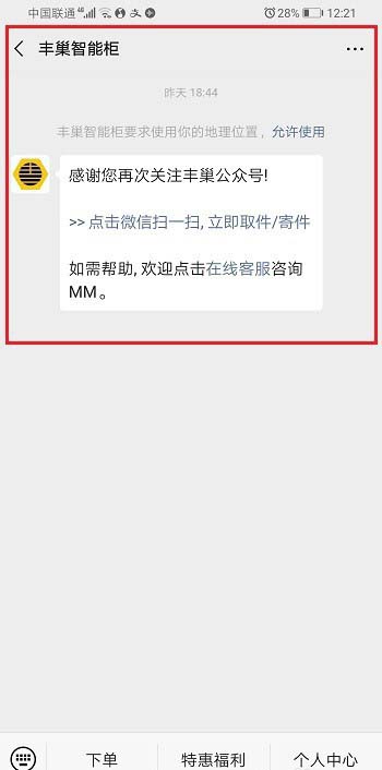 1、我们到丰巢快递柜上,使用微信扫描二维码进去公众号,如下图所示: