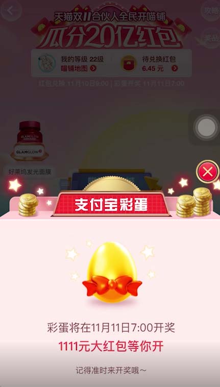 5、彩蛋于11月11日7点开奖,到时可以领取丰厚礼品。