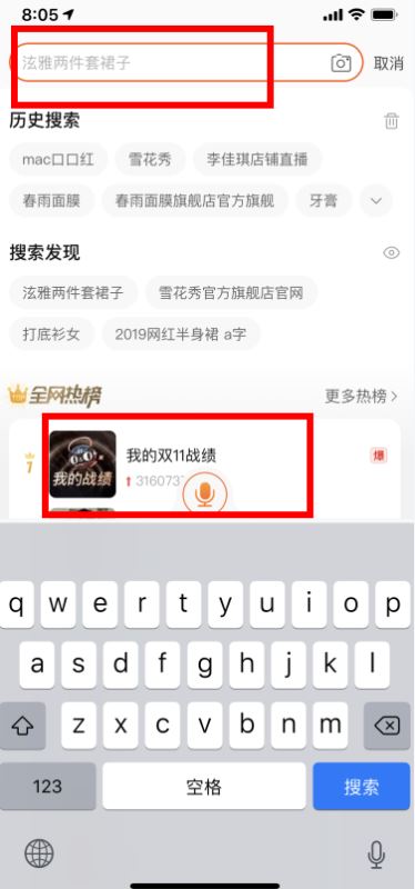 第二种方法:打开淘宝搜索框,直接热搜第一就是双11战绩,点击进入