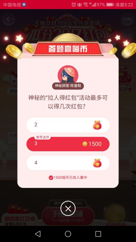 神秘的"拉人得红包"活动最多可以得几次红包?今年双十一的玩法已经公布了,用户经营喵铺、盖楼挑战、夺星挑战来赢取最终的心愿大奖。喵铺只要每天签到、浏览店铺就可以获得喵币,用来升级喵铺。那么,神秘的"拉人得红包"活动最多可以得几次红包??感兴趣的朋友快来了解一下吧。