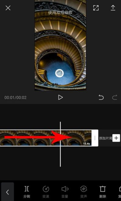 2、打开照片时长剪辑后,然后编辑框右端,然后向右拖动,拖动至目的位置后立刻松开手指,可增加照片时长