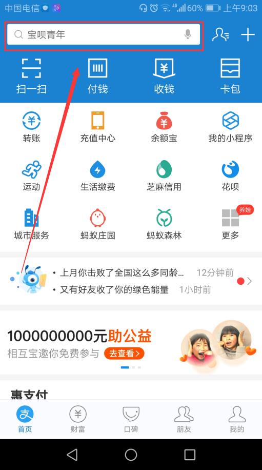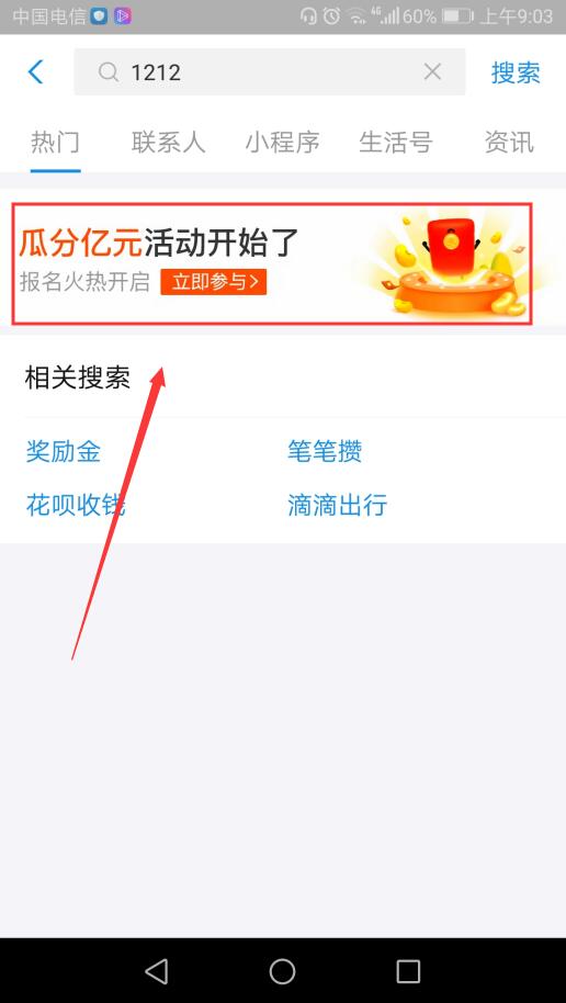 1、打开支付宝,在搜索栏里输入1212
