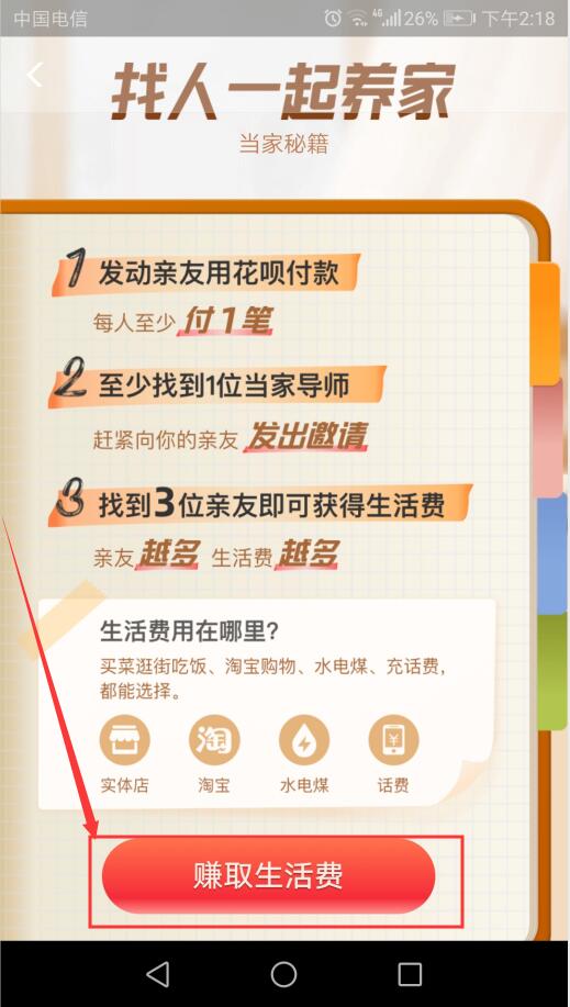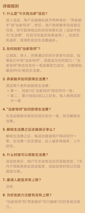 进入活动,用户会被随机赋予两种身份:“养家能手或“当家导师”,然后,用户按照要求完成指定任务,即可获得相应的花呗场景红包(活动中称为生活费”,红包可在指定场景使用),完成任务越多,获得的花呗生活费越多。