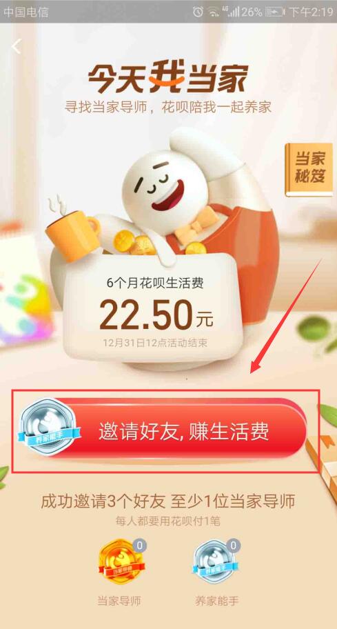 而解锁红包需要用户邀请1 个当家导师和3 个养家能手角色使用花呗 , 也就是说想使用红包必须先邀请其他用户。