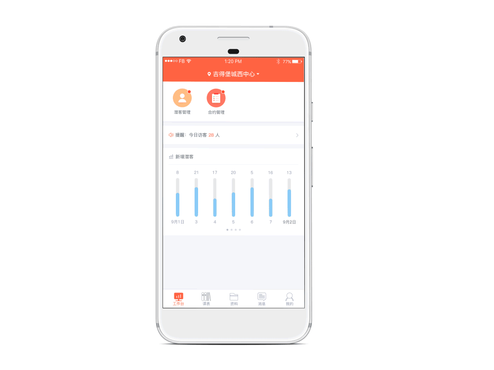 A8:打开主界面“工作台”,即可查看新增潜客情况,其他可左右滑动查看。