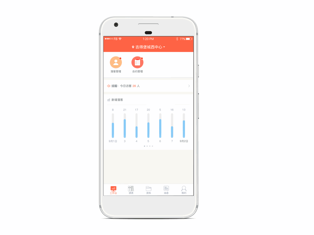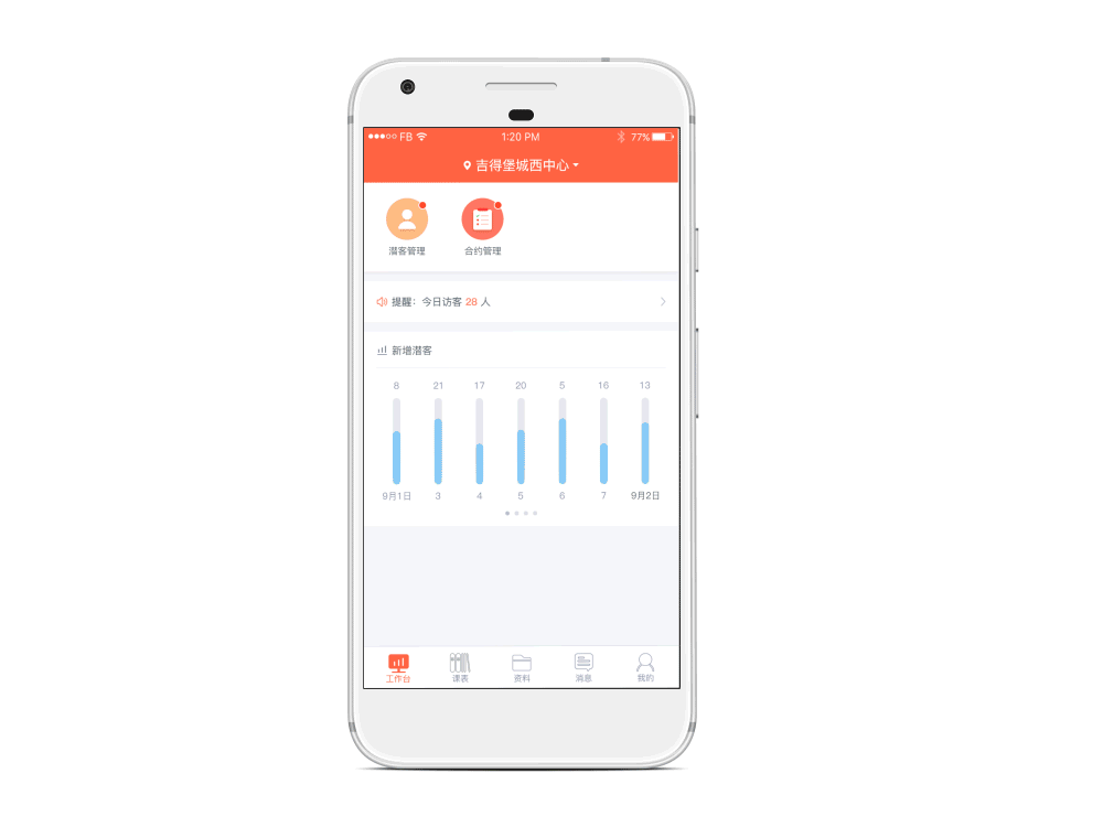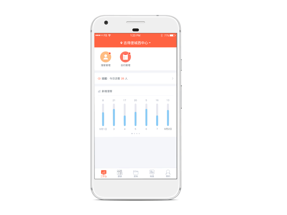 A1:首先,打开主界面“工作台”,点击“潜客管理”,即可新增潜客、报名、查看潜客列表的操作。