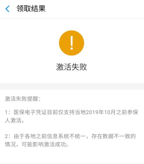二、若您领取医保电子凭证页面提示激活失败可能因为以下两种情况: