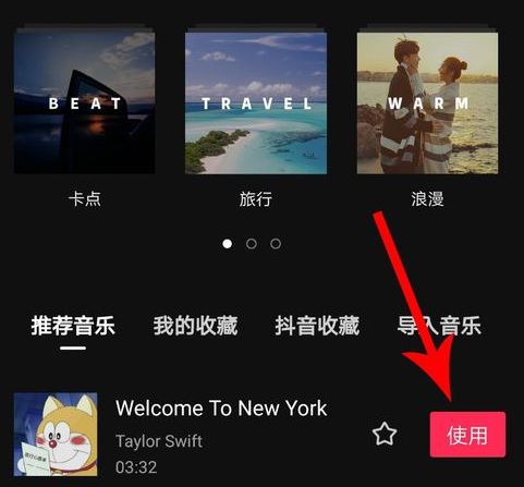打开添加音乐界面,然后点击音乐名称右侧的“使用”按钮。