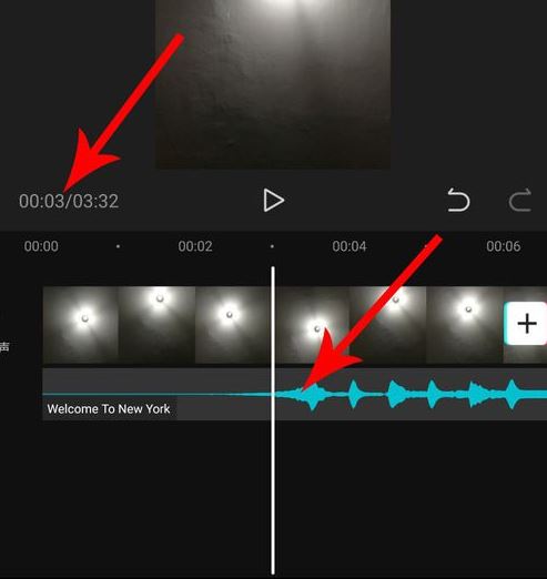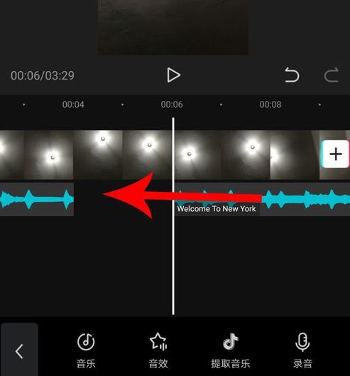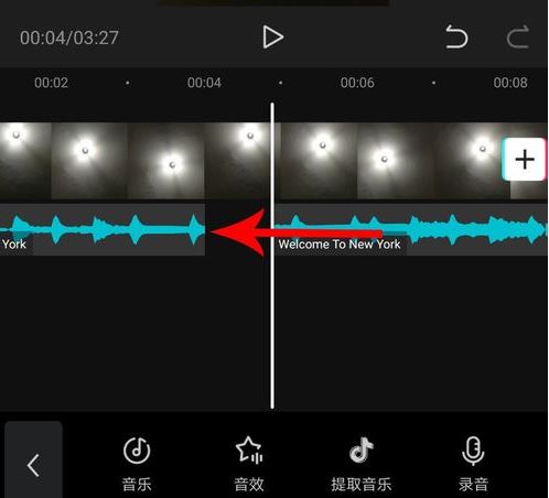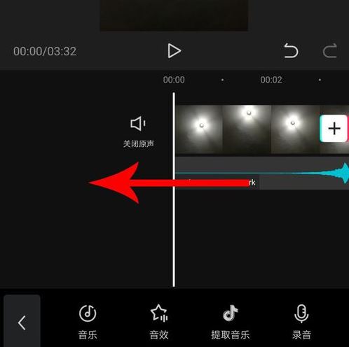 为视频添加音乐以后,按住音乐素材后向左拖动,当时间线与第3秒位置重合时停止拖动,然后点击“音乐素材”。