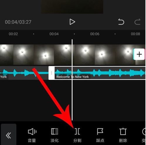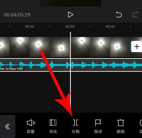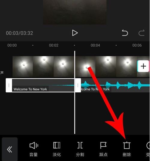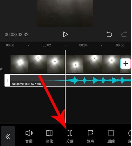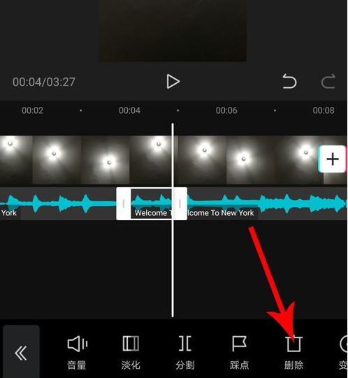 选中音乐素材后点击“分割”,将音乐素材分成两个部分后,系统会自动选中第一部分素材,然后点击“删除”。