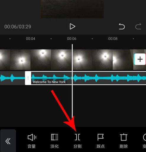 选中音乐素材后点击“分割”,然后按住整个编辑区向左拖动,当时间线与第6秒位置重合后停止拖动,然后点击“音乐素材”。