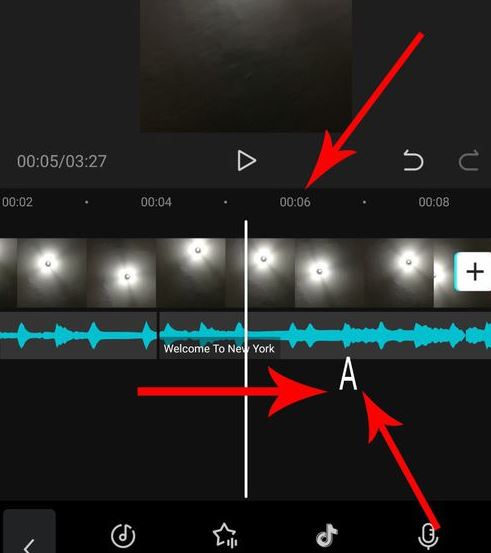 接下来做个设置:目的想要让音乐卡点位置A与视频的第6秒位置重合。为了达到此目的,首先按住整个编辑区向右拖动,然后点击“第二段音乐素材”。