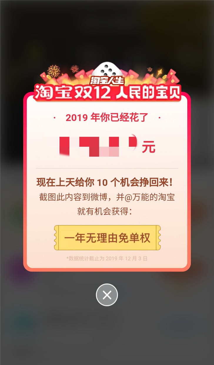 值得一提的是,如果将账单截图分享到微博并@万能的淘宝,今天开始至12月12号期间,淘宝会不定时抽取用户“一年无理由免单权”。相当于清空购物车,最高上限49999元。