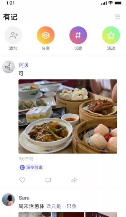 其实,有记挺好操作的,在首页可以看到添加、分享、话题和活动这四大类,也很好理解,添加就是关注好友,分享就是分享内容给其他好友或平台,话题和微博类似,带有话题发布心情会吸引更多人观看,活动应该就是官方推出的活动。