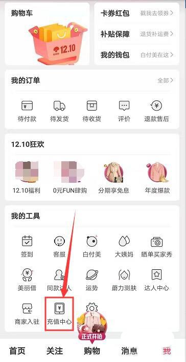 4、往下滑动,找到【充值中心】并点击。