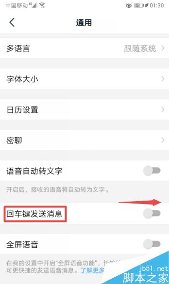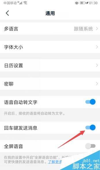 滑动完成后如图所示,这样便开启了回车键发送消息。