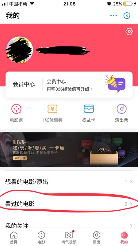 3、进入我的个人主页,往下拉,找到“看过的电影”点击进入;