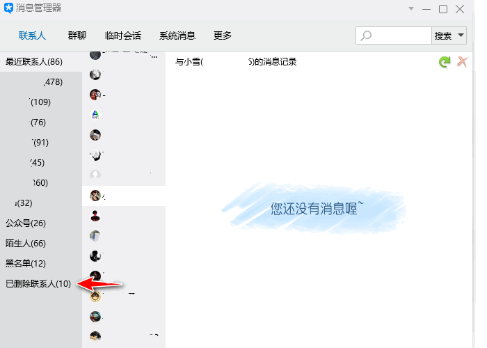 5、单击联系人头像便可以在右侧看到已删除的QQ号码。