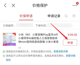 6、接着点击【申请】,若商品出现降价,价格保护申请成功后差价会退回原来的支付账户。
