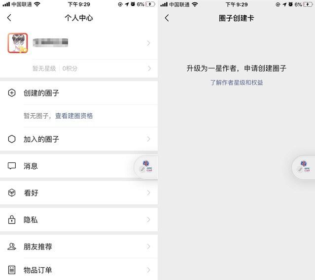 在圈子的个人中心中,则可以看到自己加入的圈子、消息、看好、隐私、朋友推荐等,还可以创建圈子。本来小编打算创建一个圈子,不过提示需要升级为一星作者,才能申请创建圈子。