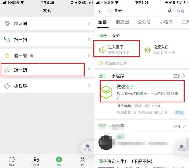 作为一项刚改名而来的新功能,目前微信圈子还比较隐藏,用户需要进入「发现」->「搜一搜」,然后搜索“圈子”找到,点击服务下方的“进入圈子”或“微信圈子”小程序均可进入,如下图所示。