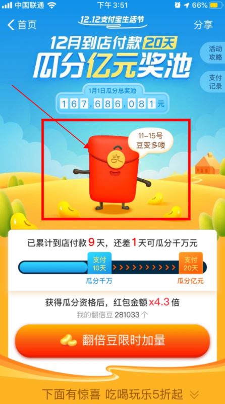 其实很简单,只要打开支付宝,点击首页最上方活动入口进入,进入之后点击红包标志就可以出现10万翻倍豆了,不过最多也就只能得到一次10万翻倍豆,其他的时候也可以抽点零星的翻倍豆哦!