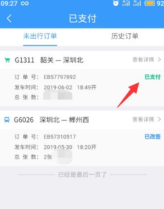 如何退票候补票?进入我的订单中心,找到已支付订单。