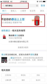 1、打开支付宝手机app在首页搜索绿色春运,点击“开启你的春运上上签”。如图所示: