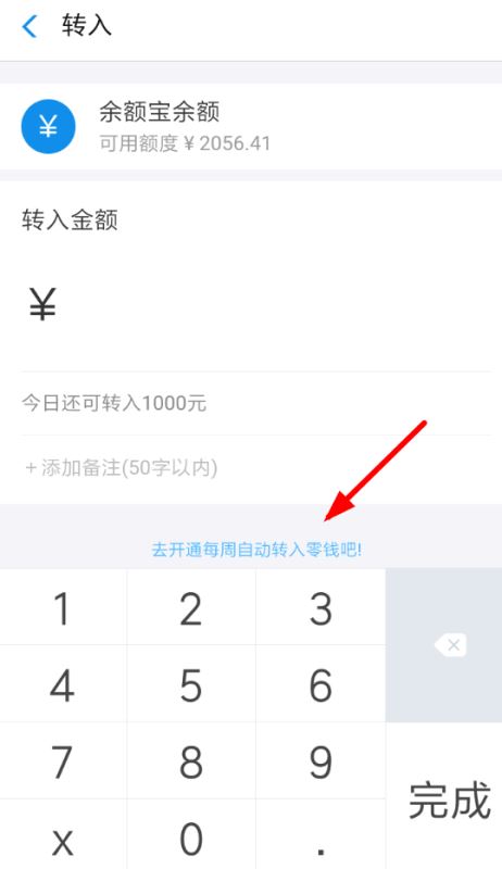 2、在“转入”页面的底端点击“去开通每周自动转入零钱”按钮,这样就可以管理定期存入资金的服务了。