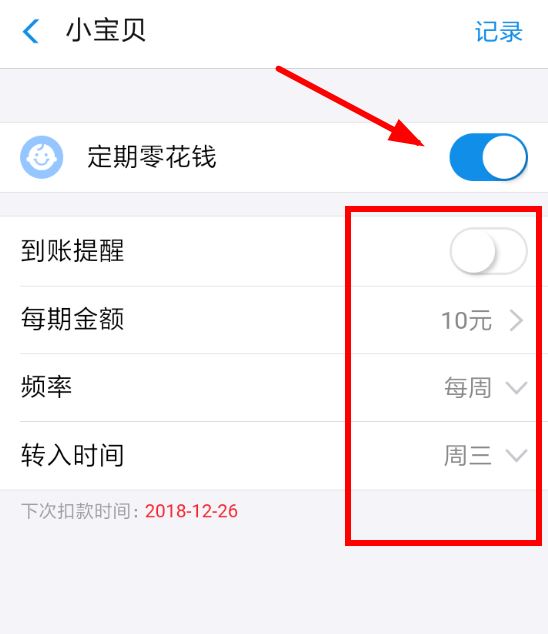 3、在详情页面中,用户不仅能够对定期转入的金额进行设置,还可以通过“定期零花钱”右侧的按钮直接关闭服务。