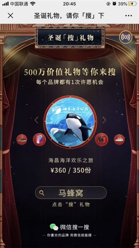 微信官方团队宣布了一项新功能,#圣诞礼物请你“搜”下# ,每到圣诞节就会忙于送礼物,却总是忘记送自己一份。微信搜一搜邀请到了“圣诞老人”朋友们。号称有500万价值的礼物等你来搜。