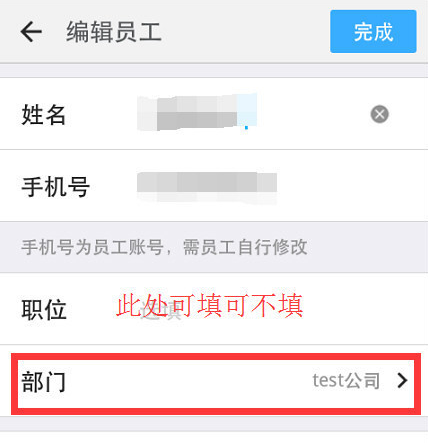 7、系统回到编辑员工的界面,点击【完成】,该员工已经被挪到测试一部。