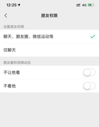 在最新的ios版本中,"朋友权限"新增“仅聊天”以及"聊天、朋友圈、微信运动等”两个权限选项。