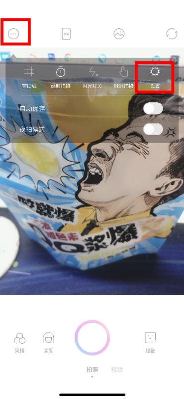 1、打开一甜相机app,点击左上角的三个点,然后会弹出更多选择,我们可以看到最右边的“设置”,直接点击一下;