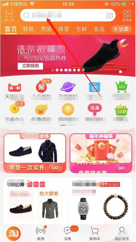 2、进入淘宝之后,点击上面的搜索框,如图所示。
