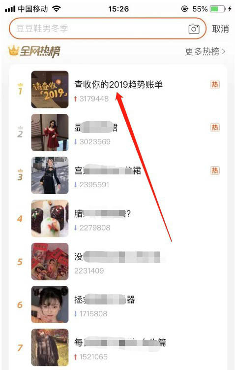3、然后就可以看到搜索第一位的“查收你的2019趋势账单”,点击进入即可。