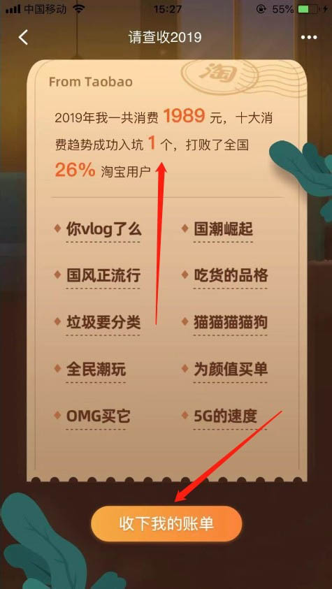 4、在活动最后一页,点击“生成我的2019趋势订单”,然后就可以看到在过去的2019年你在淘宝的消费情况。