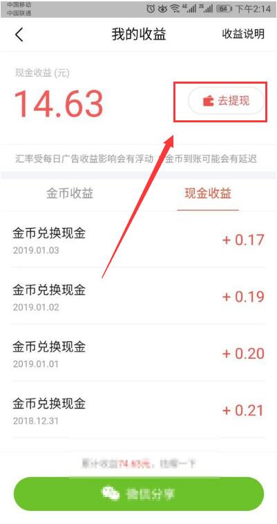 3、点击页面上的“去提现”,点击打开。